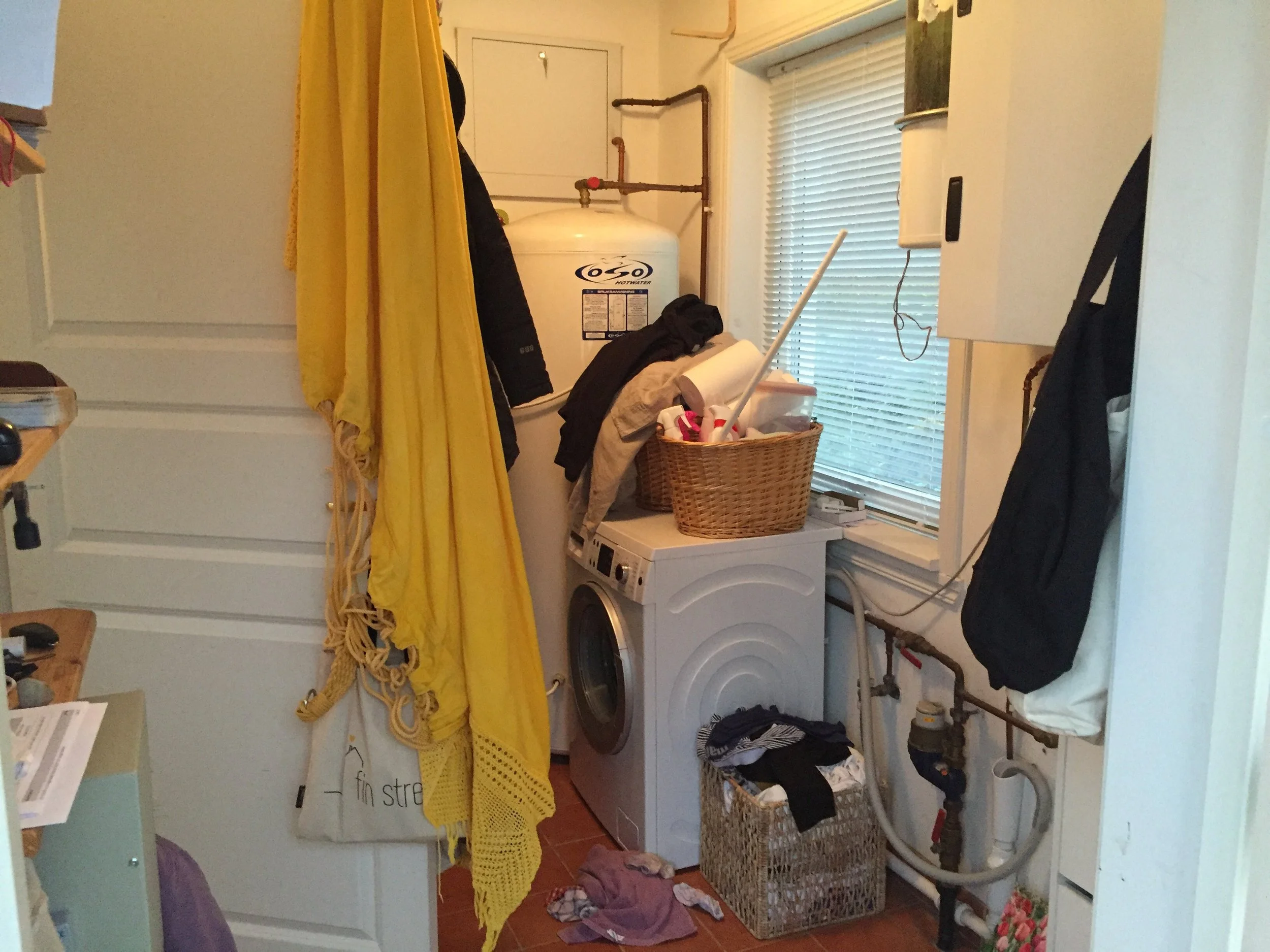 Så det var en gang en gang som så ut som en dusj. I dag er det en gang som er ryddig og fin, ikke stor, men med plass til refleksvester og sko. Vaskemaskinen er skjult, det er plass til å henge opp klesvask bak et forheng. Barna finner luer og legger det på plass selv. Belysningen er hyggelig og jeg blir glad hver dag jeg åpner døren. Og absolutt alle som kommer bemerker forskjellen, til og med fiskemannen. Jeg ønsker meg fortsatt et nytt vindfang, men den midlertidige løsningen er gått fra greit nok til god. Helt dønn ærlig tror jeg også det har reddet ekteskapet.